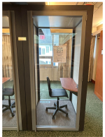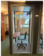 The library has two single–occupancy pods to be used as a quiet space to conduct web conferencing sessions and take phone calls. The interior of the pod measures 41” by 41” and may not be suitable for all patrons.